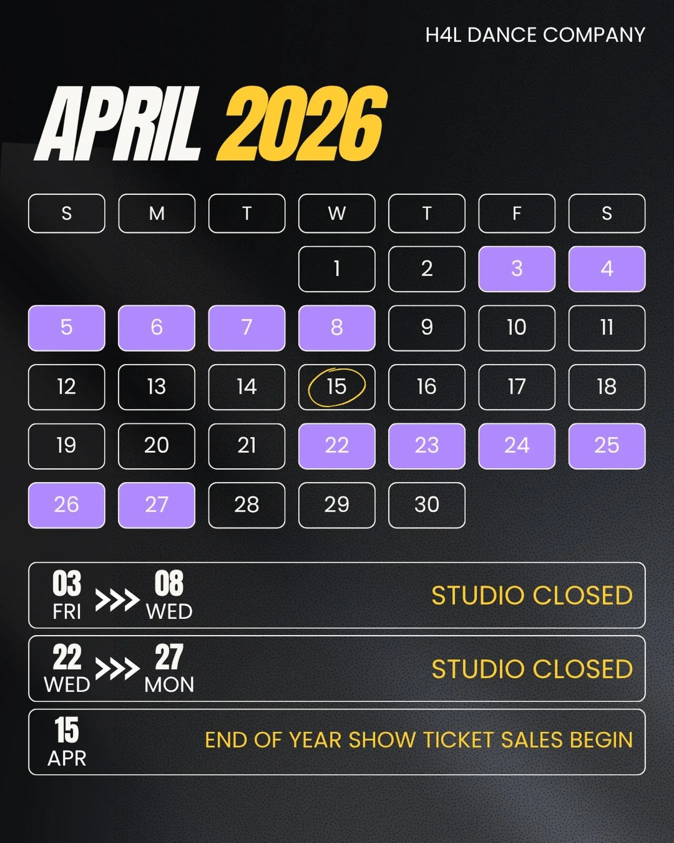 HOLIDAYS (STUDIO CLOSED) - April 3-8 2026